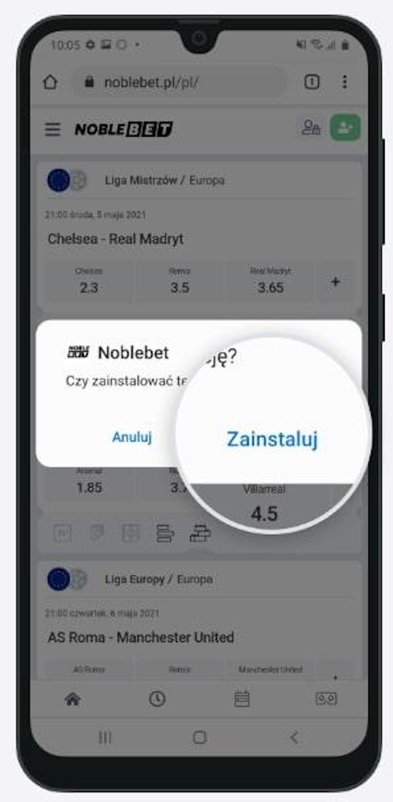 Dla osób niechętnych instalowaniem kolejnej aplikacji w swoim telefonie Noblebet wprowadził ciekawe rozwiązanie - dodanie do ekranu głównego wersji mobilnej swojej strony internetowej.